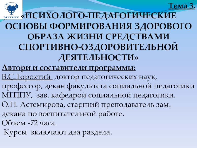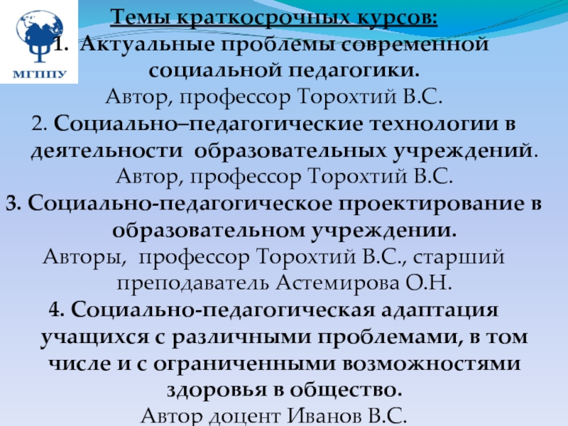 В.С.Торохтий доктор педагогических наук, профессор, декан факультета социальной педагогики МГППУ, зав. кафедрой социальной педагогики.