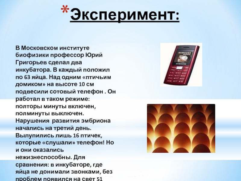каждый положил по 63 яйца. Над одним «птичьим домиком» на высоте 10 см подвесили сотовый телефон . Он работал в таком режиме: полторы минуты включен, полминуты выключен. Нарушения развития эмбриона начались на третий день. Вылупились лишь 16 птичек, которые «слушали» телефон! Но и они оказались нежизнеспособны. Для сравнения: в инкубаторе, где яйца не донимали звонками, без проблем появился на свет 51 птенец.