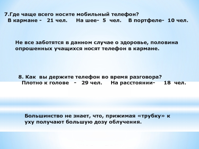 Анкетирование показало , что многие учащиеся довольно много времени проводят с телефоном, не правильно им пользуются и хранят, чем подвергают свое здоровье большой опасности.