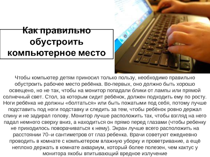 правильно обустроить рабочее место ребёнка. Во-первых, оно должно быть хорошо освещено, но не так, чтобы на монитор попадали блики от лампы или прямой солнечный свет. Стол, за которым сидит ребёнок, должен подходить ему по росту. Ноги ребёнка не должны «болтаться» или быть пожатыми под себя, потому лучше подставить под ноги подставку и следить за тем, чтобы ребёнок ровно держал спину и не задирал голову. Монитор лучше расположить так, чтобы взгляд на него падал немного сверху вниз, а находиться он прямо перед глазами (чтобы ребенку не приходилось поворачиваться к нему). Экран лучше всего расположить на расстоянии 70–и сантиметров от глаз ребенка. Врачи советуют ежедневно проводить в комнате с компьютером влажную уборку и проветривание, а ещё неплохо держать в комнате аквариум, который более полезен, чем кактус у монитора якобы впитывающий вредное излучение