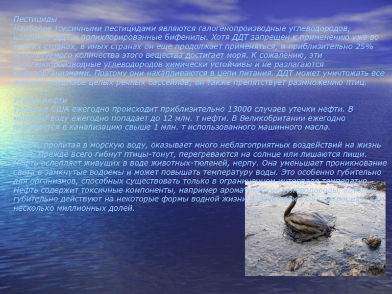 бифенилы. Хотя ДДТ запрещен к применению уже во многих странах, в иных странах он еще продолжает применяться, и приблизительно 25% используемого количества этого вещества достигает моря. К сожалению, эти галогенопроизводные углеводородов химически устойчивы и не разлагаются микроорганизмами. Поэтому они накапливаются в цепи питания. ДДТ может уничтожать все живое в масштабе целых речных бассейнов; он также препятствует размножению птиц.