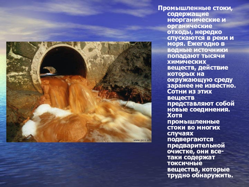 Слайд 17Промышленные стоки, содержащие неорганические и органические отходы, нередко спускаются в реки