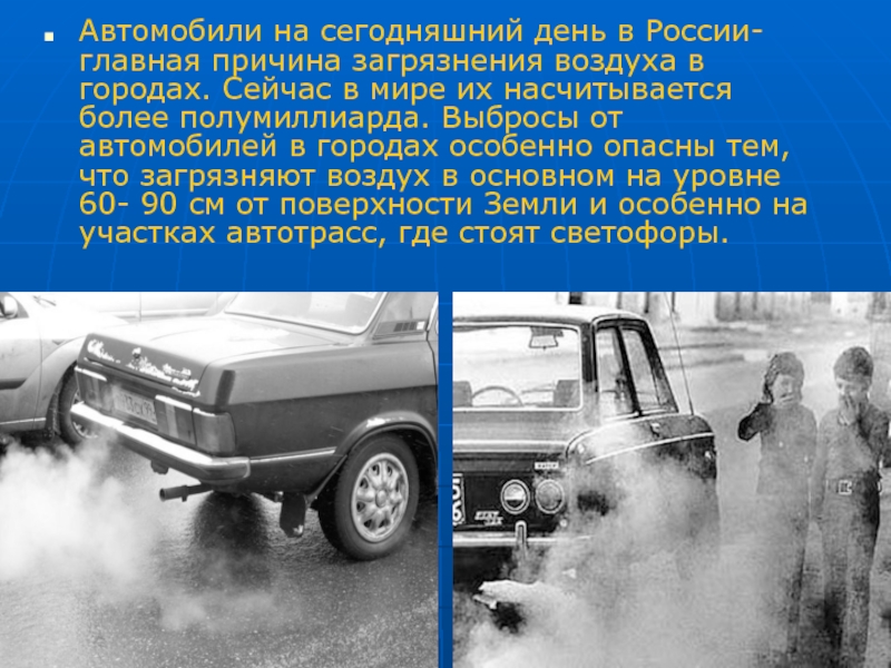 Слайд 11Автомобили на сегодняшний день в России- главная причина загрязнения воздуха в