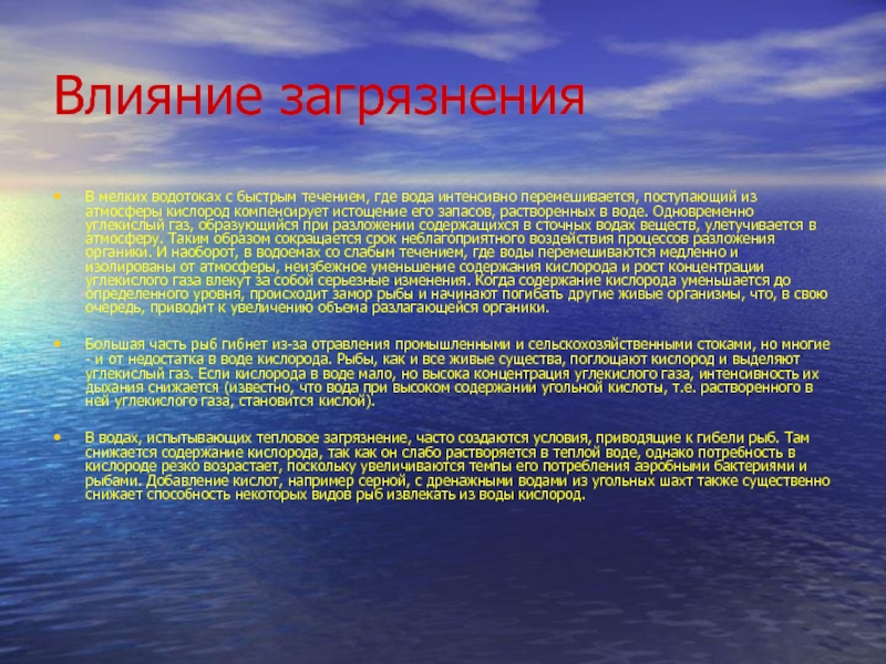 поступающий из атмосферы кислород компенсирует истощение его запасов, растворенных в воде. Одновременно углекислый газ, образующийся при разложении содержащихся в сточных водах веществ, улетучивается в атмосферу. Таким образом сокращается срок неблагоприятного воздействия процессов разложения органики. И наоборот, в водоемах со слабым течением, где воды перемешиваются медленно и изолированы от атмосферы, неизбежное уменьшение содержания кислорода и рост концентрации углекислого газа влекут за собой серьезные изменения. Когда содержание кислорода уменьшается до определенного уровня, происходит замор рыбы и начинают погибать другие живые организмы, что, в свою очередь, приводит к увеличению объема разлагающейся органики.