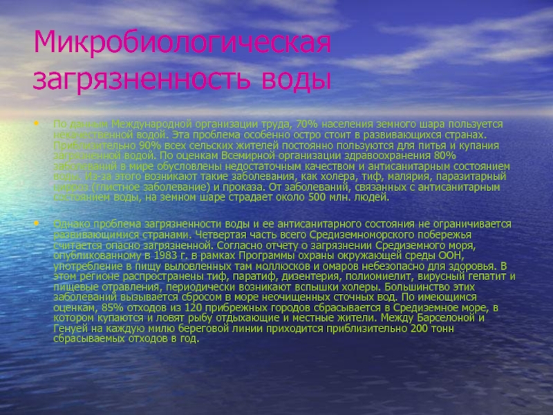 Однако проблема загрязненности воды и ее антисанитарного состояния не ограничивается развивающимися странами. Четвертая часть всего Средиземноморского побережья считается опасно загрязненной. Согласно отчету о загрязнении Средиземного моря, опубликованному в 1983 г. в рамках Программы охраны окружающей среды ООН, употребление в пищу выловленных там моллюсков и омаров небезопасно для здоровья. В этом регионе распространены тиф, паратиф, дизентерия, полиомиелит, вирусный гепатит и пищевые отравления, периодически возникают вспышки холеры. Большинство этих заболеваний вызывается сбросом в море неочищенных сточных вод. По имеющимся оценкам, 85% отходов из 120 прибрежных городов сбрасывается в Средиземное море, в котором купаются и ловят рыбу отдыхающие и местные жители. Между Барселоной и Генуей на каждую милю береговой линии приходится приблизительно 200 тонн сбрасываемых отходов в год.