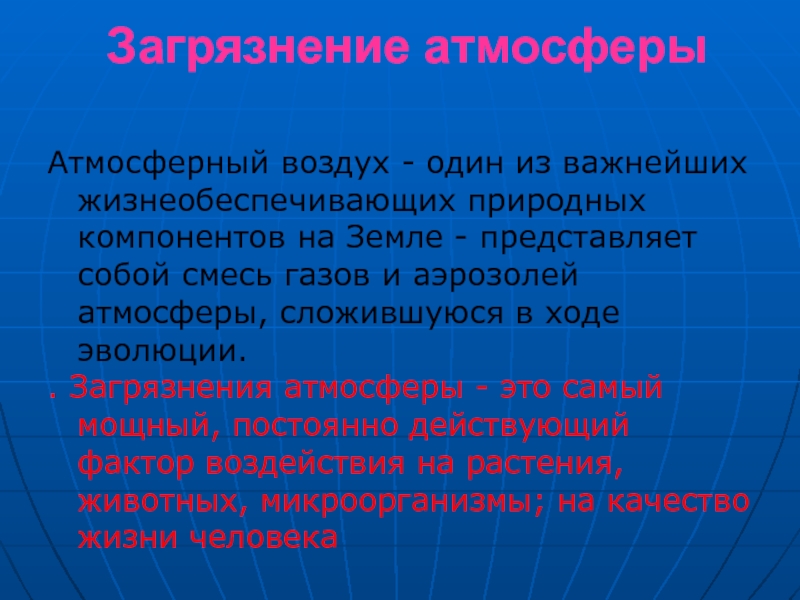 . Загрязнения атмосферы - это самый мощный, постоянно действующий фактор воздействия на растения, животных, микроорганизмы; на качество жизни человека