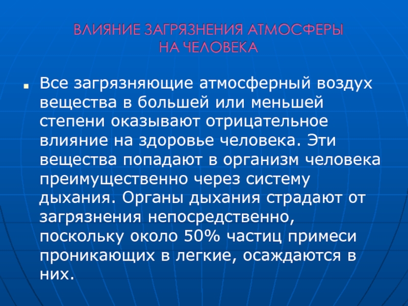 отрицательное влияние на здоровье человека. Эти вещества попадают в организм человека преимущественно через систему дыхания. Органы дыхания страдают от загрязнения непосредственно, поскольку около 50% частиц примеси проникающих в легкие, осаждаются в них.