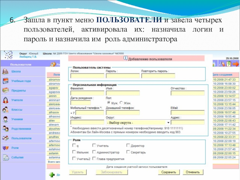 Слайд 12Зашла в пункт меню ПОЛЬЗОВАТЕЛИ и завела четырех пользователей, активировала их: