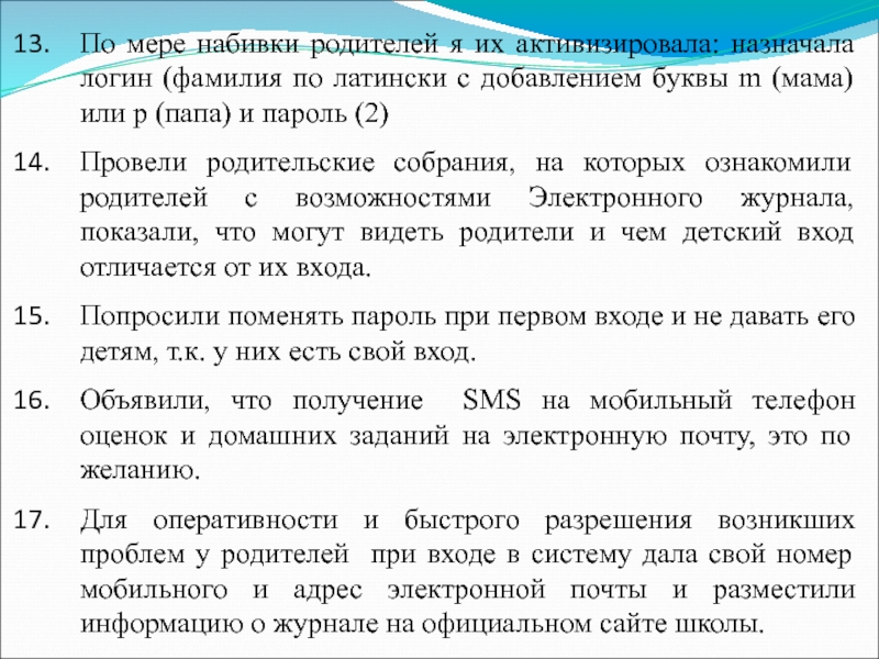 Слайд 16По мере набивки родителей я их активизировала: назначала логин (фамилия по