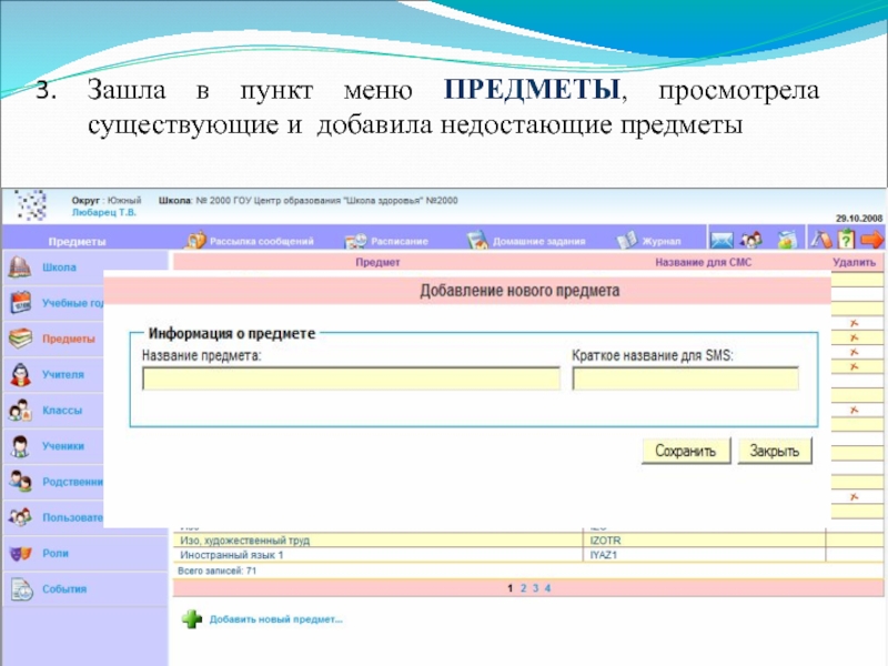 Слайд 11Зашла в пункт меню УЧИТЕЛЯ и набила учителей с указанием предметов,