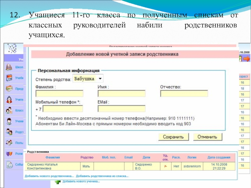 Слайд 15Учащиеся 11-го класса по полученным спискам от классных руководителей набили родственников