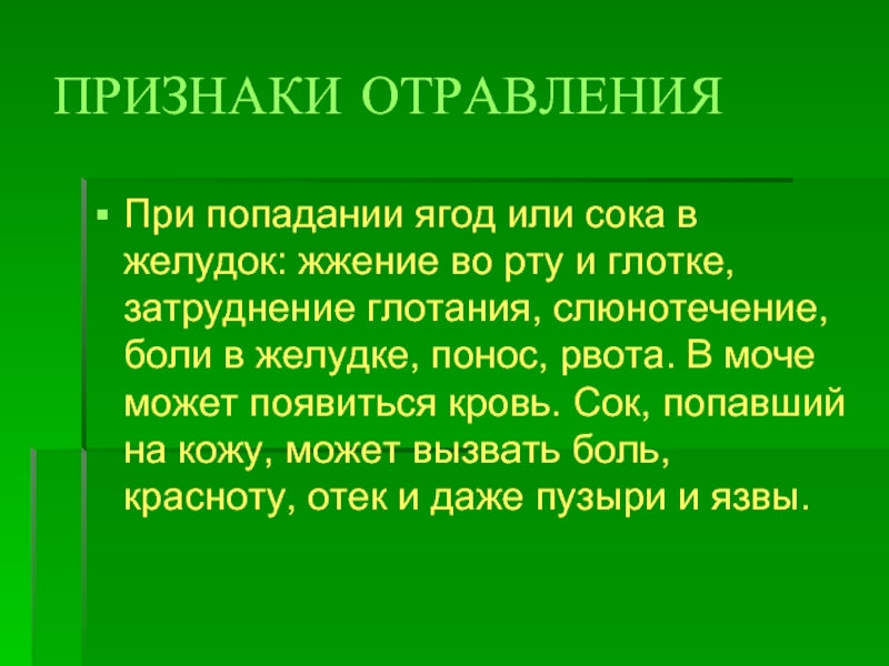и глотке, затруднение глотания, слюнотечение, боли в желудке, понос, рвота. В моче может появиться кровь. Сок, попавший на кожу, может вызвать боль, красноту, отек и даже пузыри и язвы.