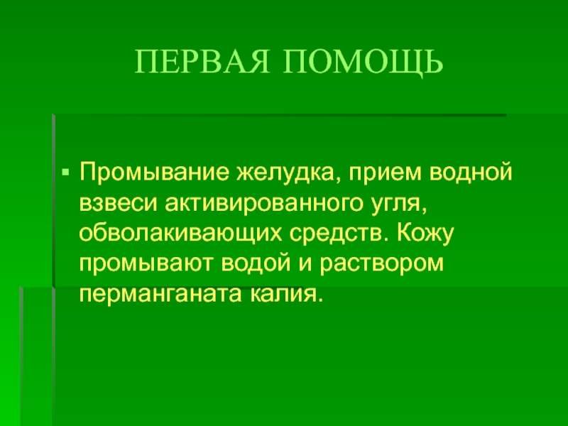 Промывание желудка, прием водной взвеси активированного угля, обволакивающих средств. Кожу