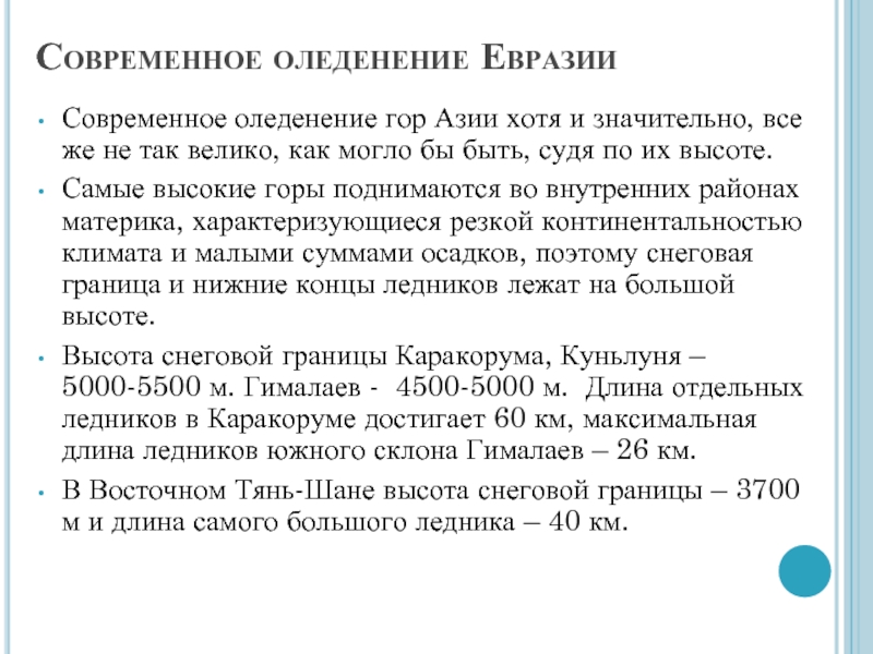 Поэтому крупными центрами современного оледенения являются не только высочайшие горные системы, как Куньлунь, Каракорум, Гималаи, Тянь-Шань, но и гораздо менее высокие, однако обильно увлажненные горы приатлантических районов.