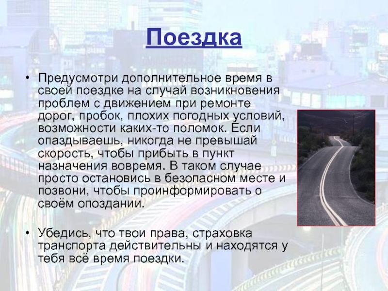 движением при ремонте дорог, пробок, плохих погодных условий, возможности каких-то поломок. Если опаздываешь, никогда не превышай скорость, чтобы прибыть в пункт назначения вовремя. В таком случае просто остановись в безопасном месте и позвони, чтобы проинформировать о своём опоздании.