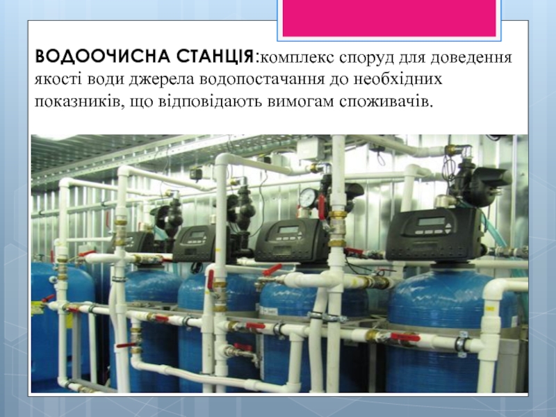 Слайд 2ВОДООЧИСНА СТАНЦІЯ:комплекс споруд для доведення якості води джерела водопостачання до необхідних