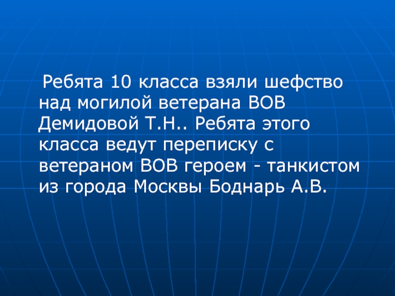 Демидовой Т.Н.. Ребята этого класса ведут переписку с ветераном ВОВ героем - танкистом из города Москвы Боднарь А.В.