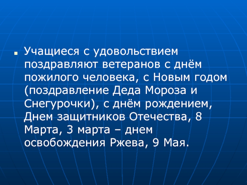 годом (поздравление Деда Мороза и Снегурочки), с днём рождением, Днем защитников Отечества, 8 Марта, 3 марта – днем освобождения Ржева, 9 Мая.