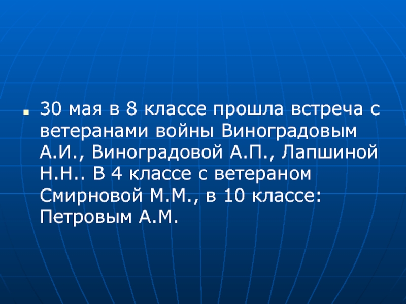 А.И., Виноградовой А.П., Лапшиной Н.Н.. В 4 классе с ветераном Смирновой М.М., в 10 классе: Петровым A.M.