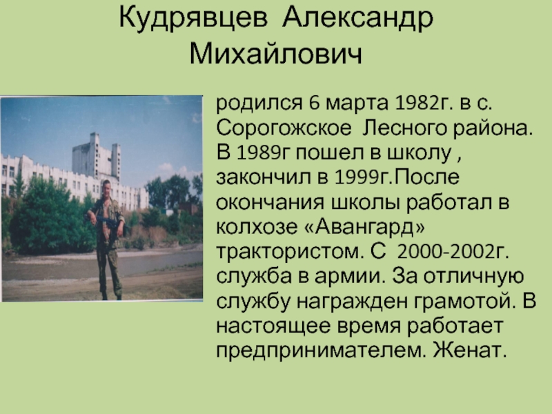«Привет, мои дорогие, мамочка и папочка и все родные и близкие. Это письмо я отдам своему другу, который сегодня 20 марта уезжает домой. Так письмо дойдет быстрее. У меня всё хорошо. Нас, тверских, перевели к своим, мы снова вместе. Следующая партия увольняемых будет моя - 14 или 15 апреля. Вот такие у меня дела. Не волнуйтесь, всё хорошо. Я вас люблю. С любовью. Сергей. 20 .03.2000.»