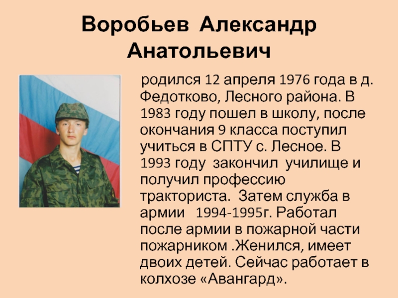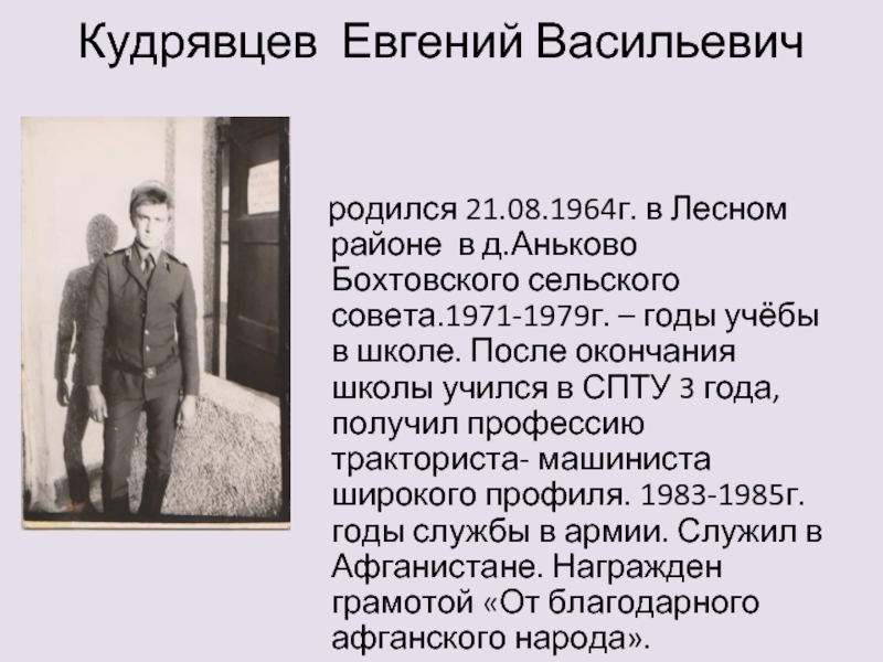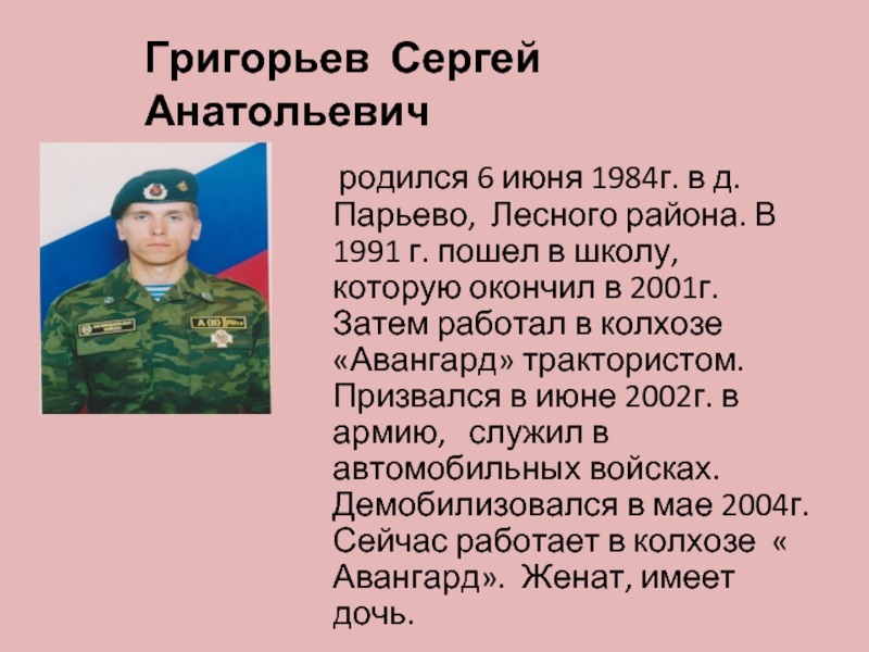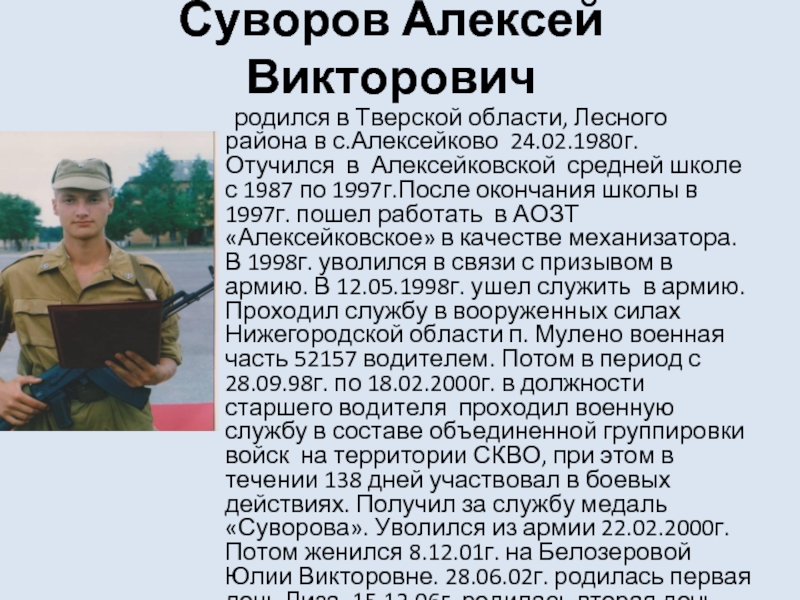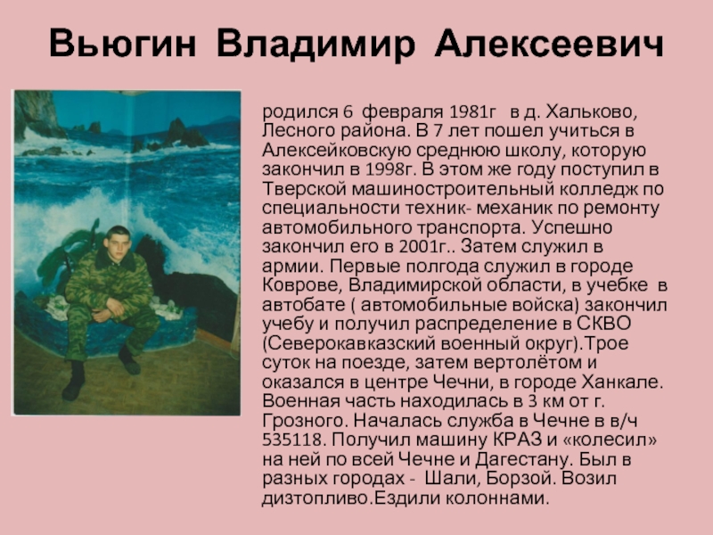 «Здравствуйте, мои любимые! Вот я и в своей родной части. Завтра 14 февраля в 5ч. 45 мин. Уезжаем на электричке в Тулу. Это Софринская бригада. Будем жить дальше, будет новая жизнь. Но все будет хорошо, я верю. Жизнь прекрасна, сейчас это понимаешь, ту цену дома, которую понять суждено не всем. Мамочка, только, пожалуйста,не волнуйся. Ты мне очень нужна и помни это всегда. Папочка, уж пожалуйста, держитесь вместе. Вот пока и всё. Я вас люблю родные мои. Не переживайте. Пока ,с любовью. Сергей. 13 02.2000. До скорой встречи».