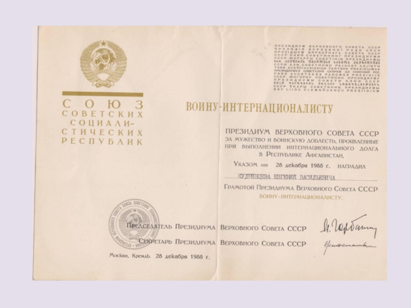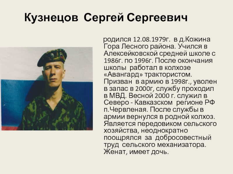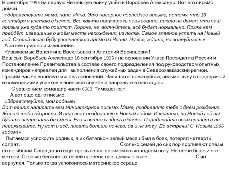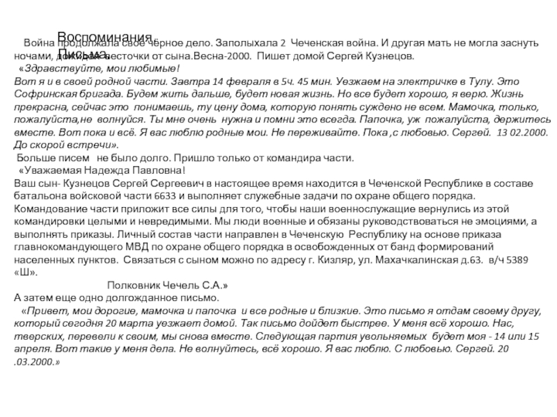 «Уважаемая Надежда Павловна! Ваш сын- Кузнецов Сергей Сергеевич в настоящее время находится в Чеченской Республике в составе батальона войсковой части 6633 и выполняет служебные задачи по охране общего порядка. Командование части приложит все силы для того, чтобы наши военнослужащие вернулись из этой командировки целыми и невредимыми. Мы люди военные и обязаны руководствоваться не эмоциями, а выполнять приказы. Личный состав части направлен в Чеченскую Республику на основе приказа главнокомандующего МВД по охране общего порядка в освобожденных от банд формирований населенных пунктов. Связаться с сыном можно по адресу г. Кизляр, ул. Махачкалинская д.63. в/ч 5389 «Ш».