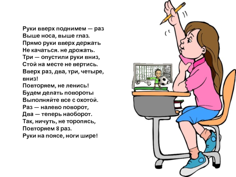 Руки вверх поднимем — раз Выше носа, выше глаз. Прямо руки вверх держать Не