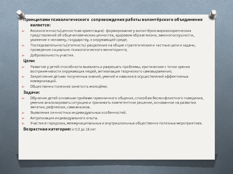 Слайд 4Принципами психологического сопровождения работы волонтёрского объединения является: