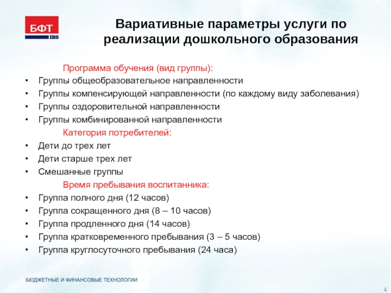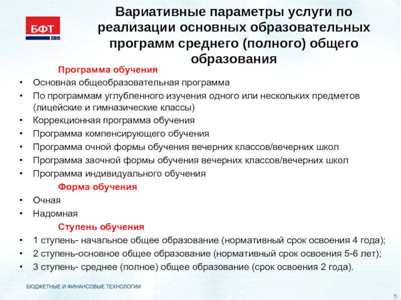 Вариативные параметры услуги по реализации основных образовательных программ среднего (полного) общего образования