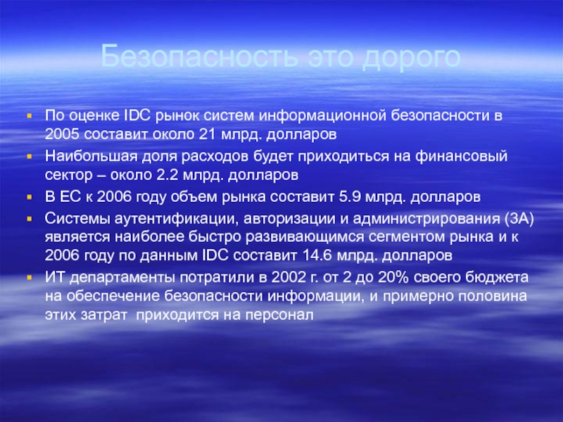 ИТ департаменты потратили в 2002 г. от 2 до 20% своего бюджета на обеспечение безопасности информации, и примерно половина этих затрат приходится на персонал