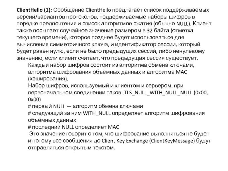 Это значение говорит о том, что шифрование выполняться не будет и потому все сообщения до Client Key Exchange (ClientKeyMessage) будут отправляться открытым текстом.