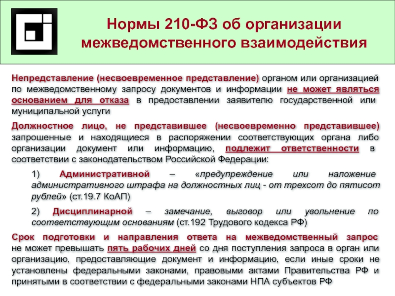 Должностное лицо, не представившее (несвоевременно представившее) запрошенные и находящиеся в распоряжении соответствующих органа либо организации документ или информацию, подлежит ответственности в соответствии с законодательством Российской Федерации: