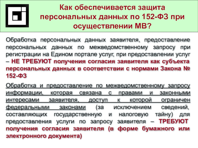 Обработка персональных данных заявителя, предоставление персональных данных по межведомственному запросу при регистрации на Едином портале услуг, при предоставлении услуг – НЕ ТРЕБУЮТ получения согласия заявителя как субъекта персональных данных в соответствии с нормами Закона № 152-ФЗ