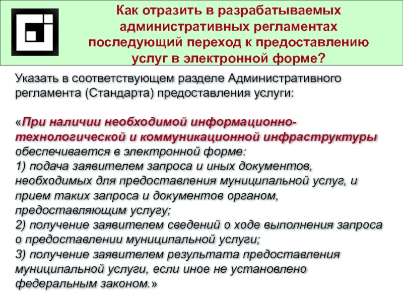 Указать в соответствующем разделе Административного регламента (Стандарта) предоставления услуги: