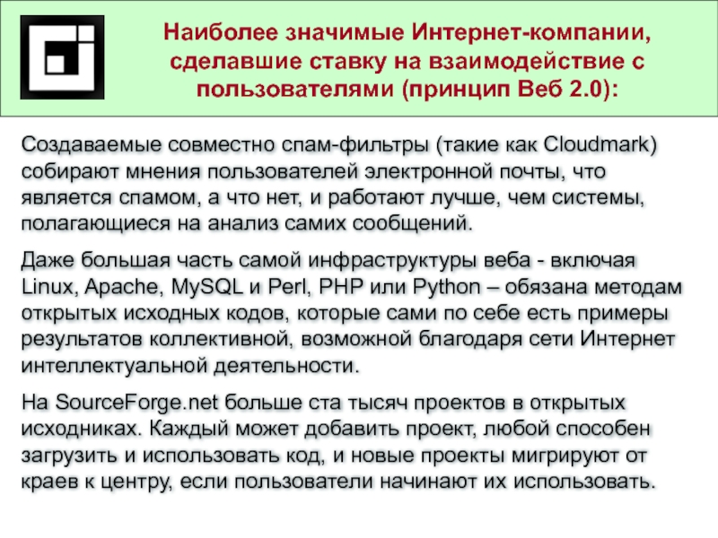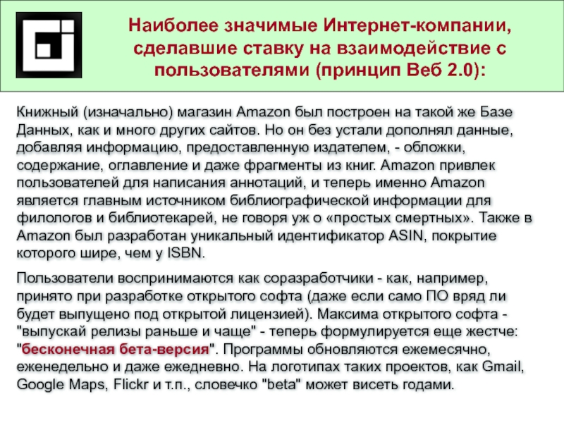 Наиболее значимые Интернет-компании, сделавшие ставку на взаимодействие с пользователями (принцип Веб 2.0):