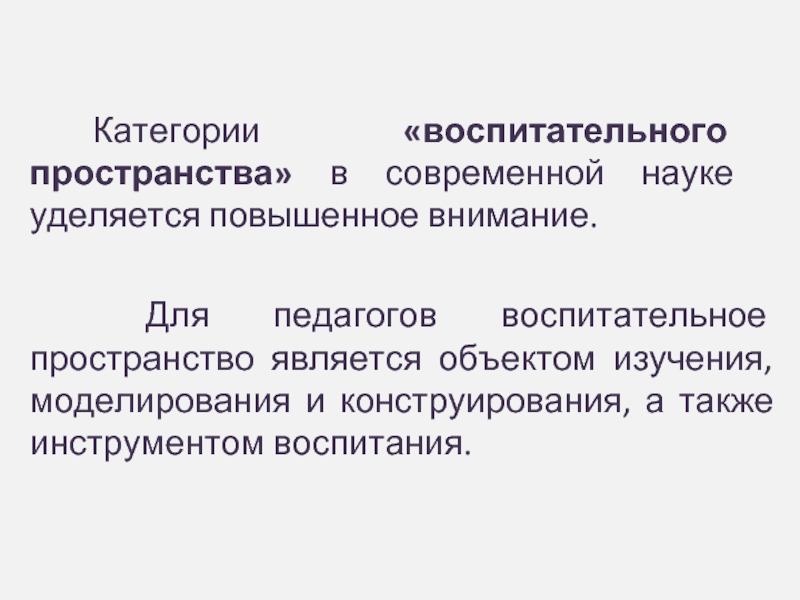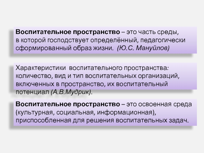 Воспитательное пространство – это освоенная среда (культурная, социальная, информационная), приспособленная для решения воспитательных задач.