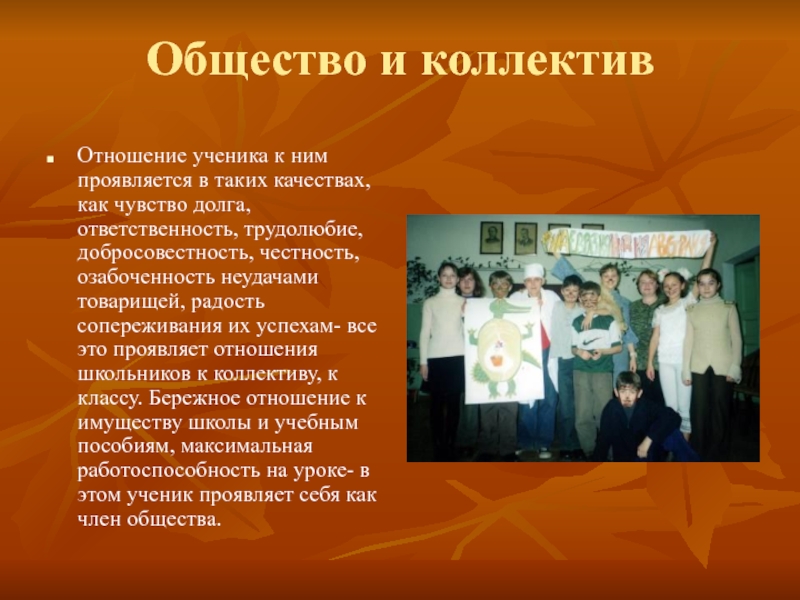 чувство долга, ответственность, трудолюбие, добросовестность, честность, озабоченность неудачами товарищей, радость сопереживания их успехам- все это проявляет отношения школьников к коллективу, к классу. Бережное отношение к имуществу школы и учебным пособиям, максимальная работоспособность на уроке- в этом ученик проявляет себя как член общества.