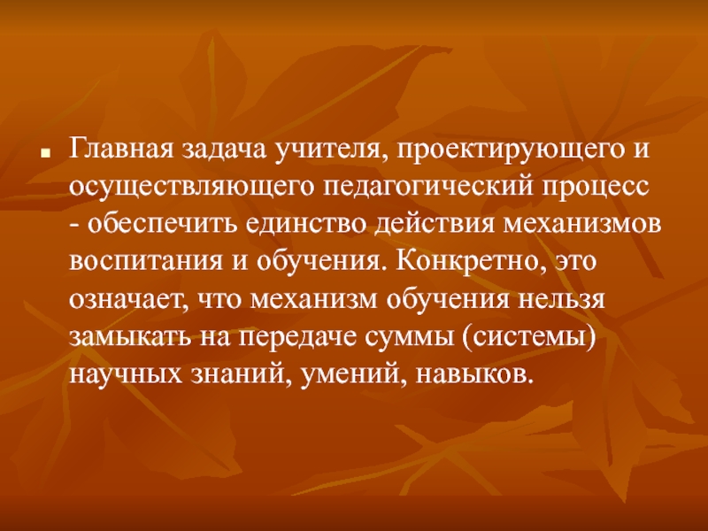 действия механизмов воспитания и обучения. Конкретно, это означает, что механизм обучения нельзя замыкать на передаче суммы (системы) научных знаний, умений, навыков.