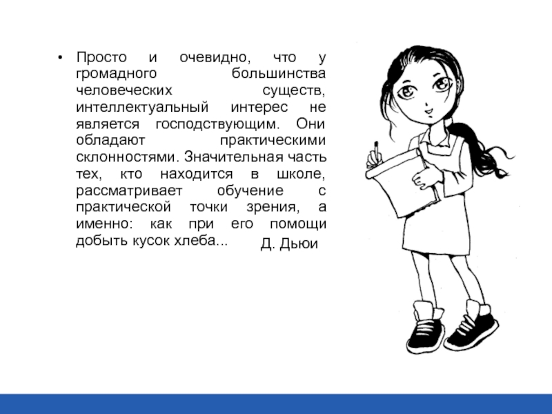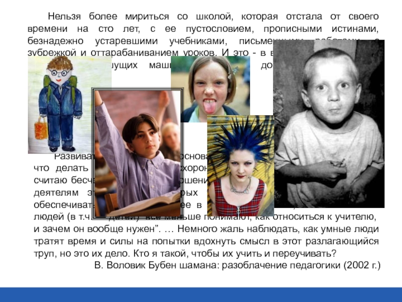 Нельзя более мириться со школой, которая отстала от своего времени на сто лет, с ее пустословием, прописными истинами, безнадежно устаревшими учебниками, письменными работами, с зубрежкой и оттарабаниванием уроков. И это - в век фотографии, кино, грамзаписи, пишущих машинок, железных дорог, автомобилей и самолетов!