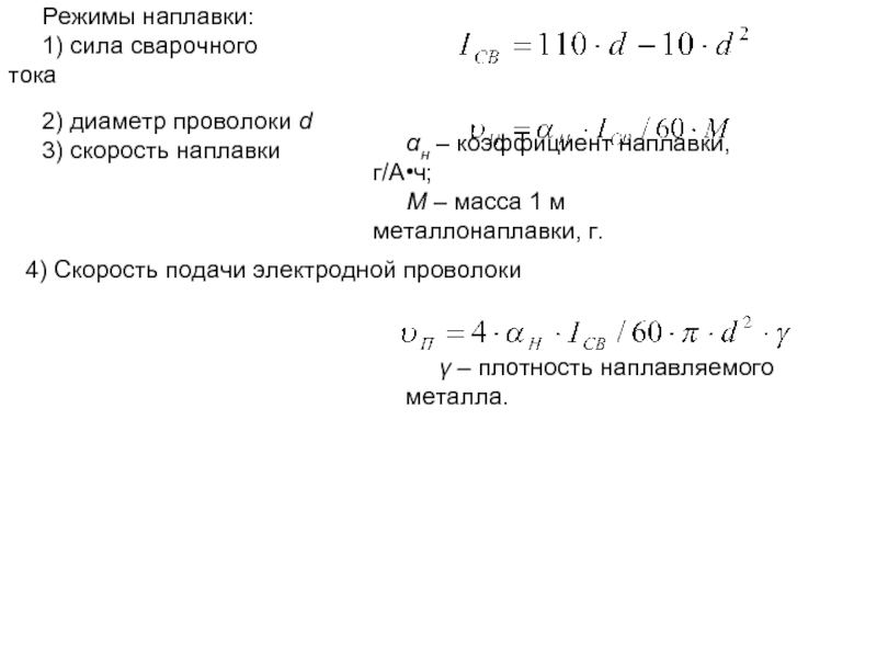 Режимы сварки: сила сварочного тока; напряжение питания дуги; диаметр, вылет и скорость подачи электродной проволоки, скорость сварки, расход углекислого газа.