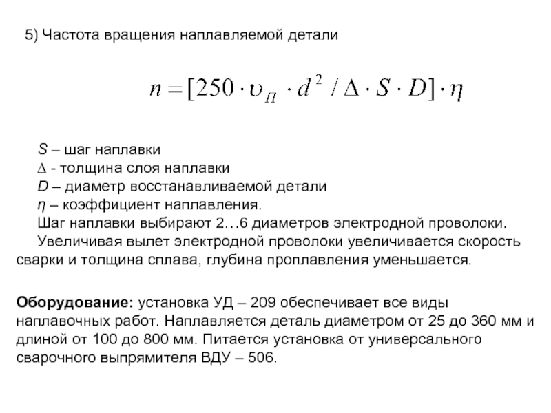 Оборудование: установка УД – 209 обеспечивает все виды наплавочных работ. Наплавляется деталь диаметром от 25 до 360 мм и длиной от 100 до 800 мм. Питается установка от универсального сварочного выпрямителя ВДУ – 506.