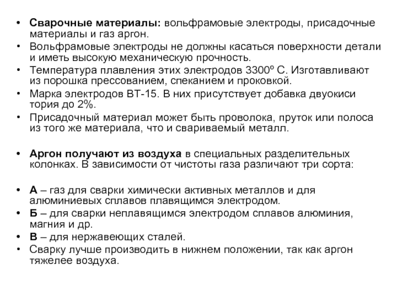Слайд 8Сварочные материалы: вольфрамовые электроды, присадочные материалы и газ аргон.