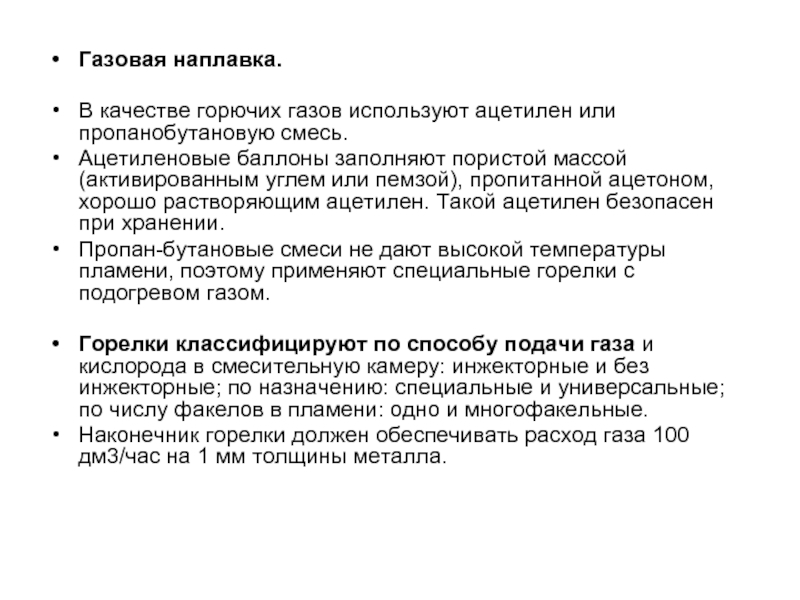 В качестве горючих газов используют ацетилен или пропанобутановую смесь.