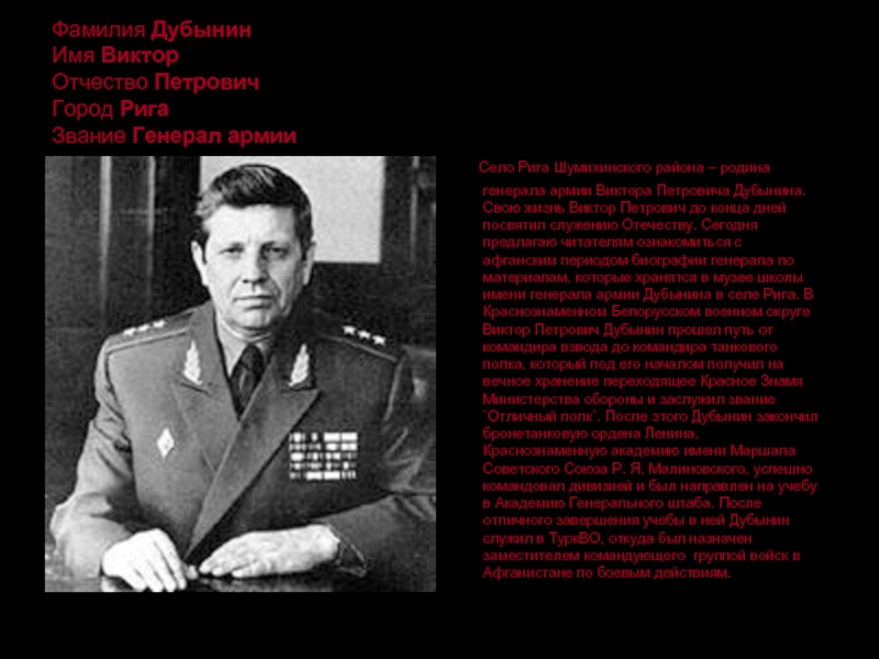 района – родина генерала армии Виктора Петровича Дубынина. Свою жизнь Виктор Петрович до конца дней посвятил служению Отечеству. Сегодня предлагаю читателям ознакомиться с афганским периодом биографии генерала по материалам, которые хранятся в музее школы имени генерала армии Дубынина в селе Рига. В Краснознаменном Белорусском военном округе Виктор Петрович Дубынин прошел путь от командира взвода до командира танкового полка, который под его началом получил на вечное хранение переходящее Красное Знамя Министерства обороны и заслужил звание `Отличный полк`. После этого Дубынин закончил бронетанковую ордена Ленина, Краснознаменную академию имени Маршала Советского Союза Р. Я. Малиновского, успешно командовал дивизией и был направлен на учебу в Академию Генерального штаба. После отличного завершения учебы в ней Дубынин служил в ТуркВО, откуда был назначен заместителем командующего группой войск в Афганистане по боевым действиям.