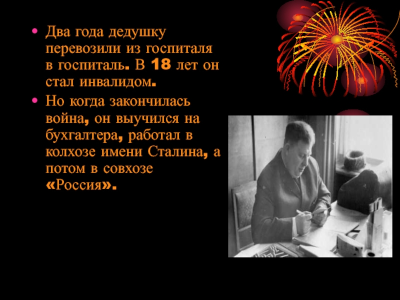 Слайд 9Два года дедушку перевозили из госпиталя в госпиталь. В 18 лет