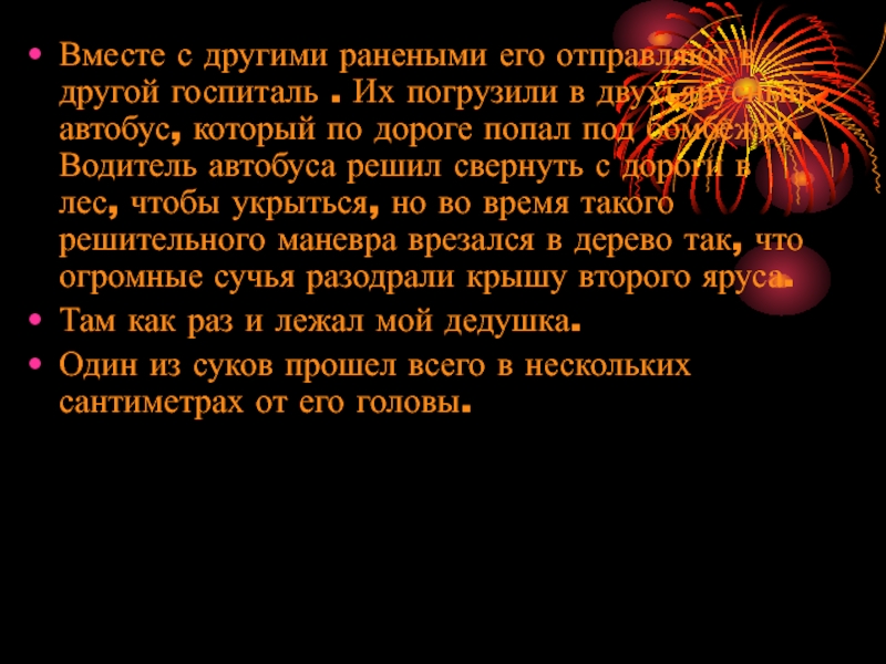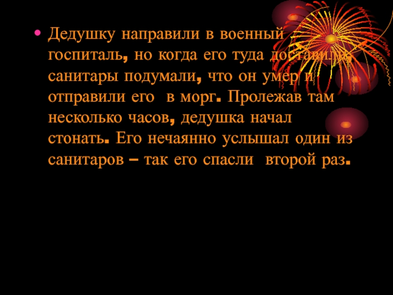 Слайд 6Дедушку направили в военный госпиталь, но когда его туда доставили, санитары