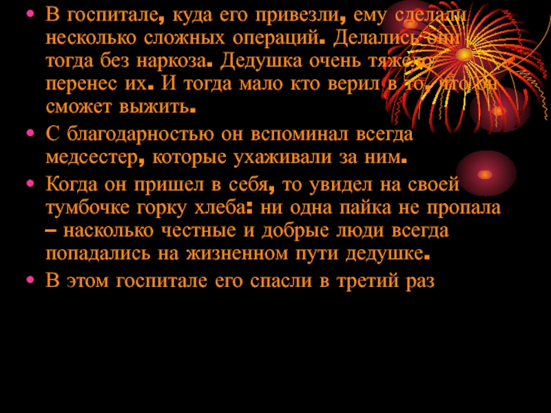 Слайд 8В госпитале, куда его привезли, ему сделали несколько сложных операций. Делались