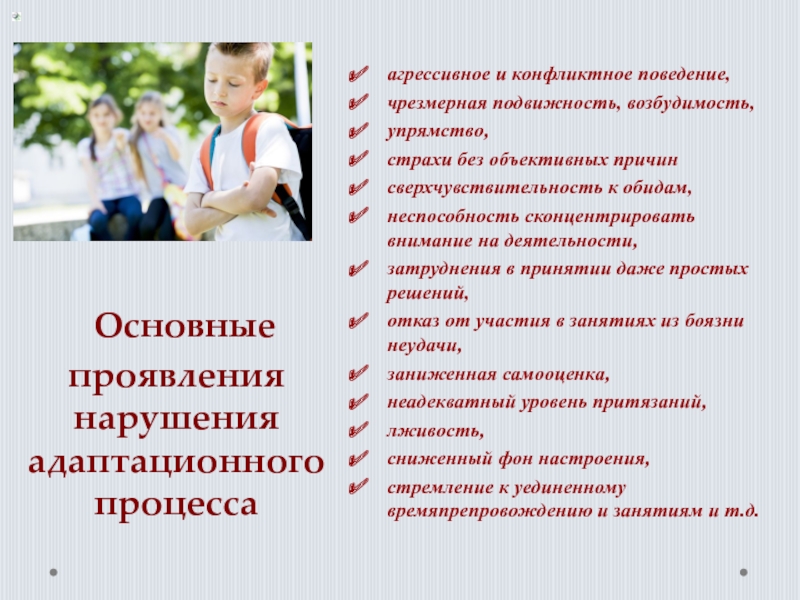 Слайд 5 Основные проявления нарушения адаптационного процесса