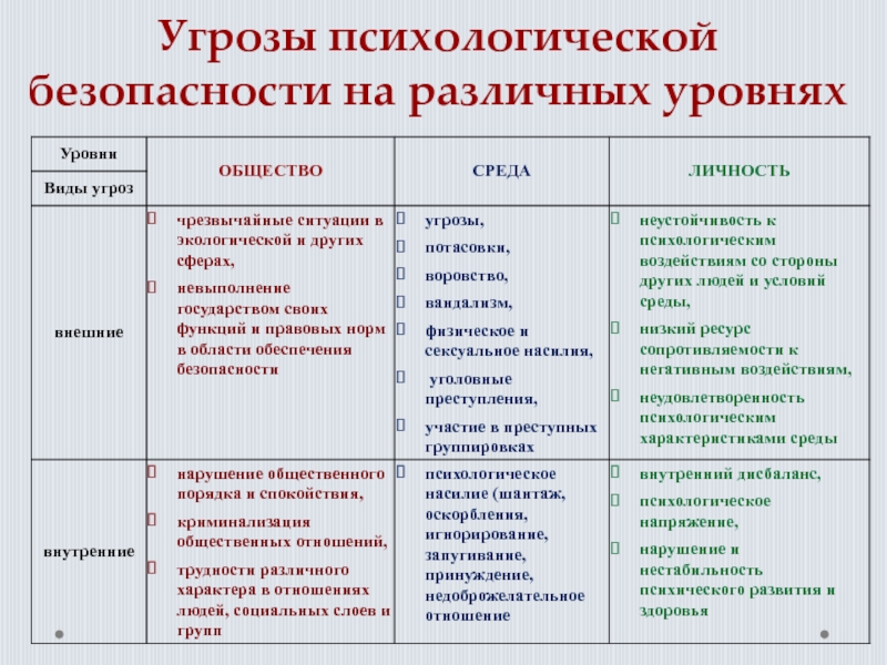 Слайд 15Угрозы психологической безопасности на различных уровнях