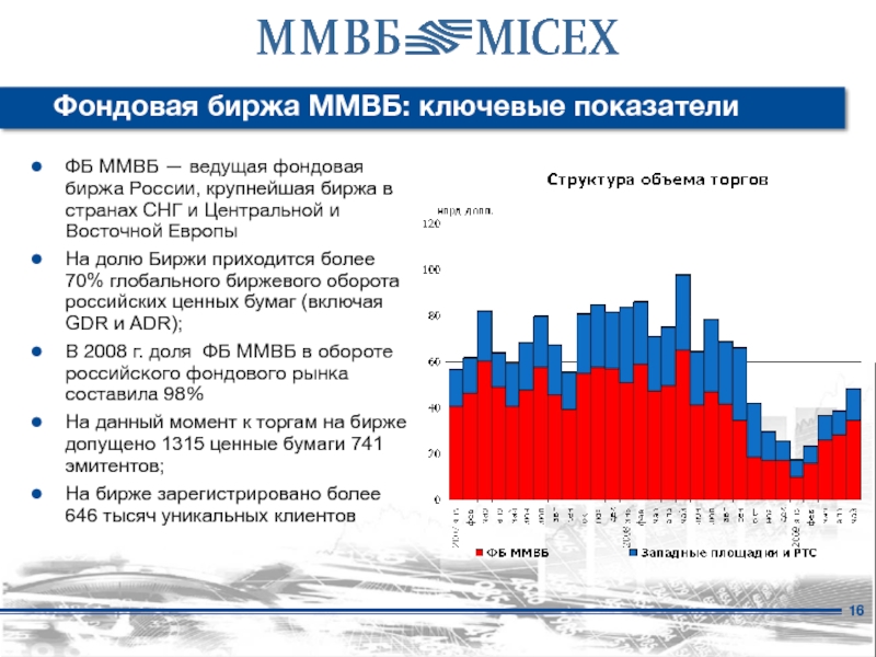 Слайд 16Фондовая биржа ММВБ: ключевые показатели